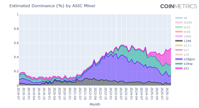 The best ASIC is not always the most expensive or the most powerful one. Surprisingly, the majority of miners operating at the turn of 2025-2026 are models released a year and a half ago or more, such as the Bitmain Antminer S21 series (representing 23% of Bitcoin's total hashrate according to CoinMetrics — more on that below). Today, adequate ASIC miner profitability is ensured by equipment with an energy efficiency range of 13 to 16.5 W/TH. Profitability analysis in mining calculators is best when based on commonly used models than on top models.