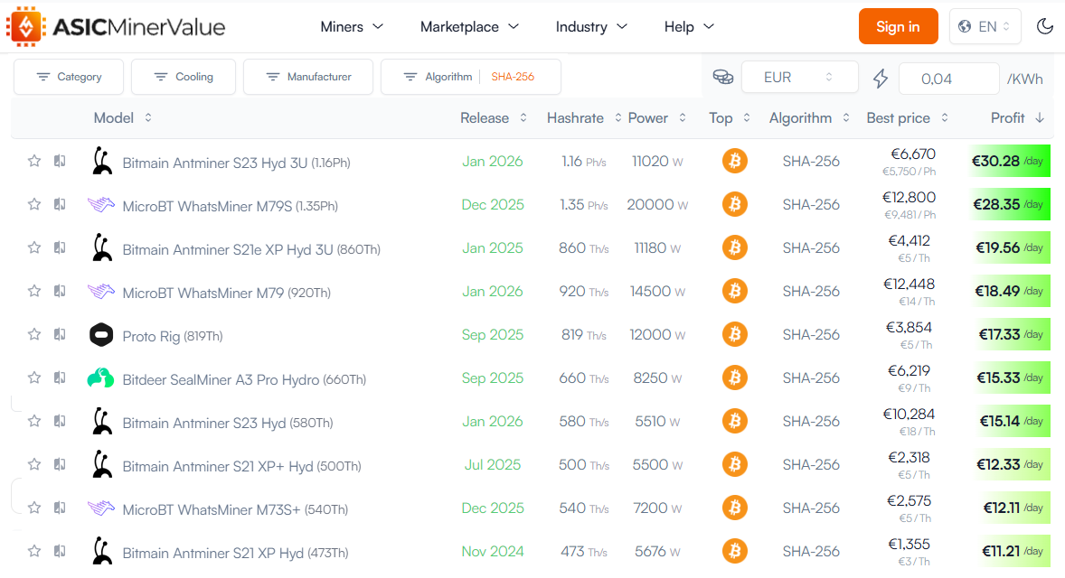 Here is top 10 ASIC miner list according to the asicminervalue.com calculator as of mid-January 2026: