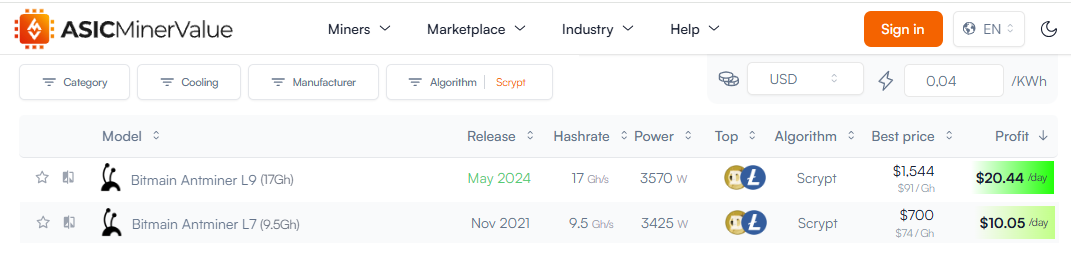 Also, you won’t find the most profitable miners for alternative proof-of-work (POW) cryptocurrencies using the Scrypt algorithm at the very top of mining calculator rankings. This algorithm is primarily used for mining Dogecoin (DOGE), Litecoin (LTC), and Aleo. In this segment, Bitmain mining equipment also leads the market, similarly to the SHA-256 segment.