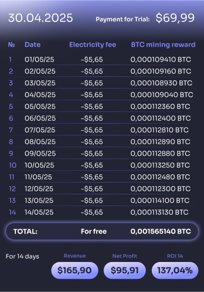 What is the Trial? It's not just a service offered by a mining company; it's an educational and financial experiment that gives you access to Bitcoin mining for 14 days, and allows you to evaluate its effectiveness through the bitcoins you earn!