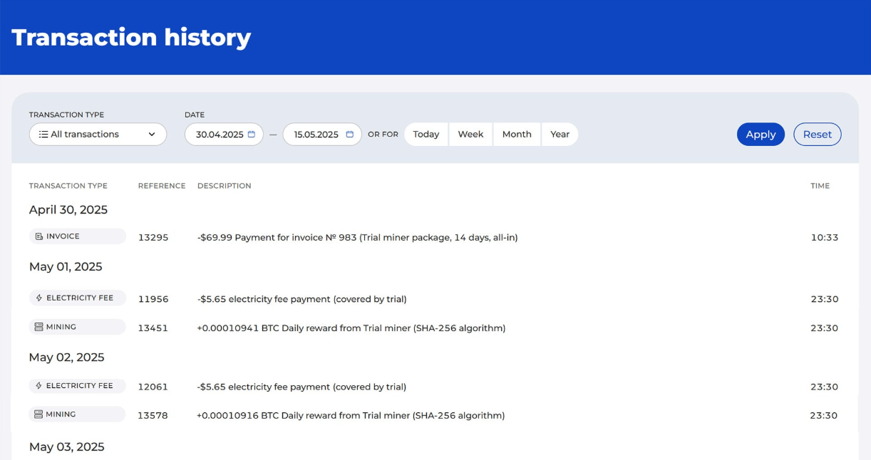 You pay for the Trial - $69.99 (transaction #13295). There will be no further expenses on your part. This payment includes all electricity costs. Bitcoin mining starts working for you, and the next day you receive your first mining payout (transaction #13451). Another day later, you get a second mining payout (transaction #13578), and so on for all 14 days!