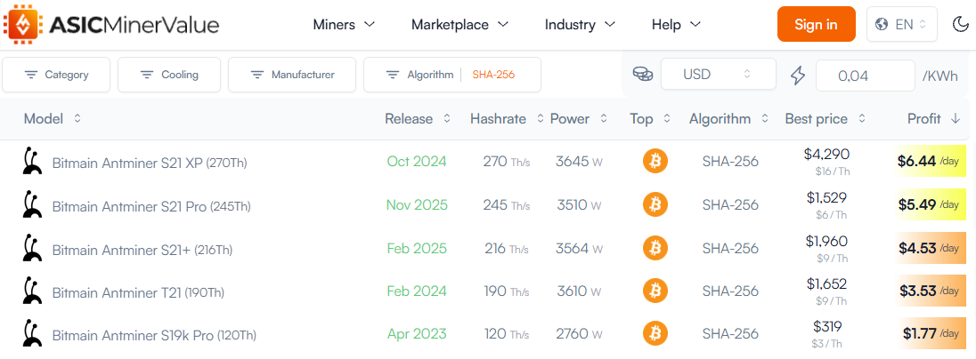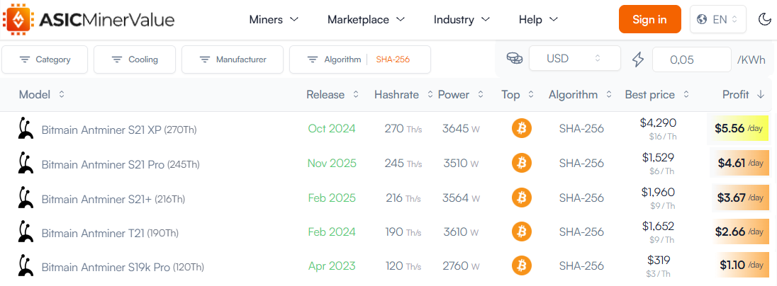 Энергоэффективность майнера - это Power / Hashrate (из этой таблицы). Лучшая энергоэффективность у S21 XP - 3,645 W / 270 TH/s = 13.5 W/TH. Это число показывает, сколько ватт электроэнергии тратит майнер на операции в секунду. Чем хуже энергоэффективность, тем меньше прибыль майнера. Добавьте сюда немаловажный факт о том, что энергоэффективность майнера со временем ухудшается в силу естественных причин, особенно если плохо его обслуживать (забивается пылью система охлаждения, чипы перегреваются и хуже работают).