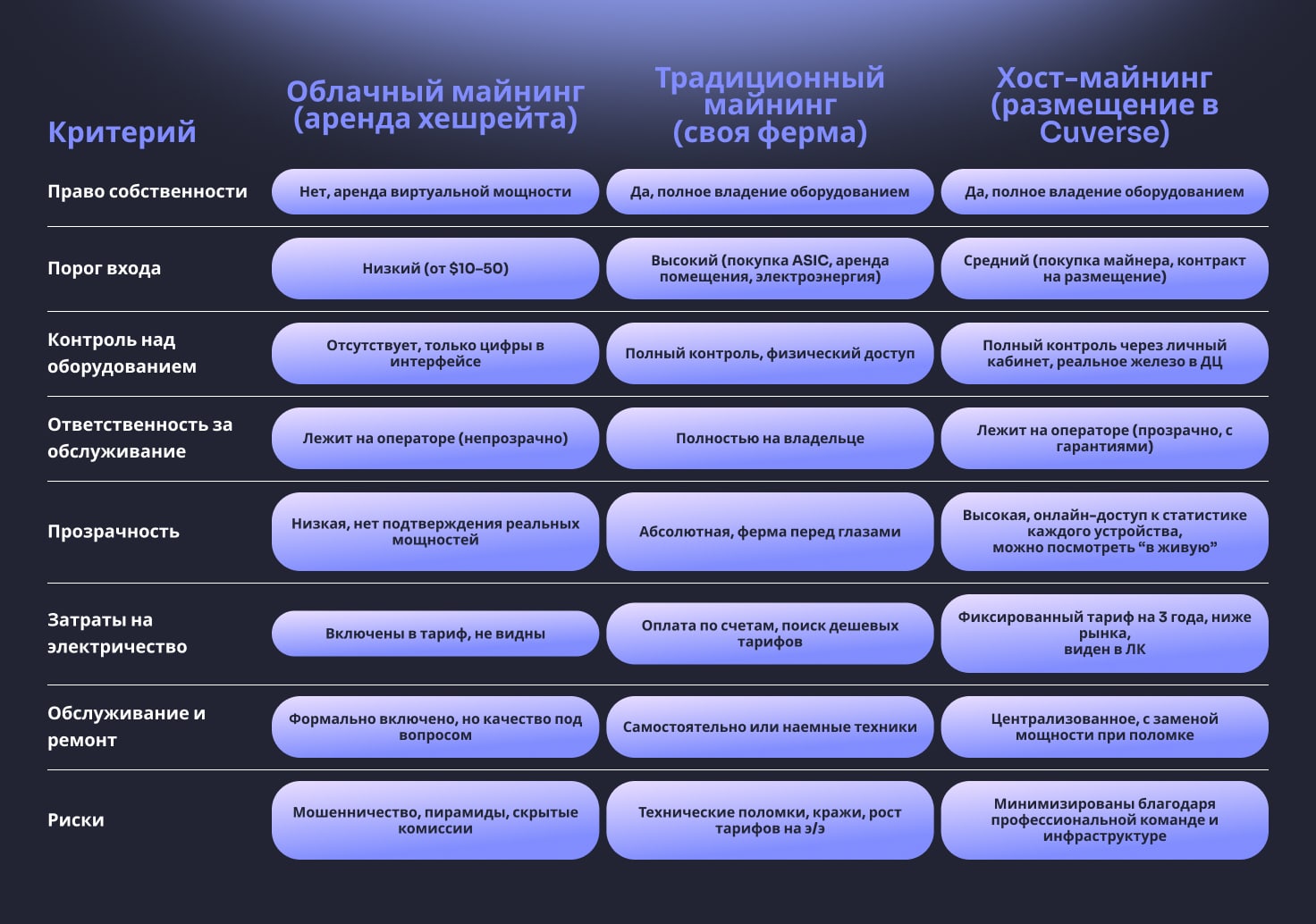 Чтобы понять, какая модель майнинга подходит именно вам, важно увидеть принципиальные различия между классическим облачным майнингом, традиционным майнингом на собственном оборудовании и гибридным форматом — хост-майнингом (размещением). Сравним ключевые параметры: