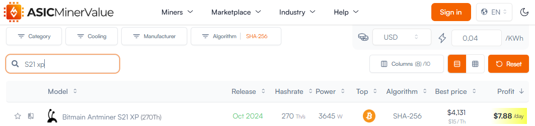 Здесь для оценки доходности майнера Antminer S21 XP необходимо перейти на вкладку ASIC, выбрать алгоритм хеширования Биткоина SHA-256, вписать в поля характеристики майнера (в нашем случае S21 XP): характеристика хешрейта 270 TH/s и энергопотребление 3,645 W, выбрать стоимость электричества (мы указали $0.04 / кВт*ч).
